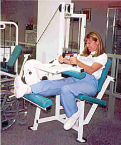 First, transfer, sit on machine, and place right foot on pedal.